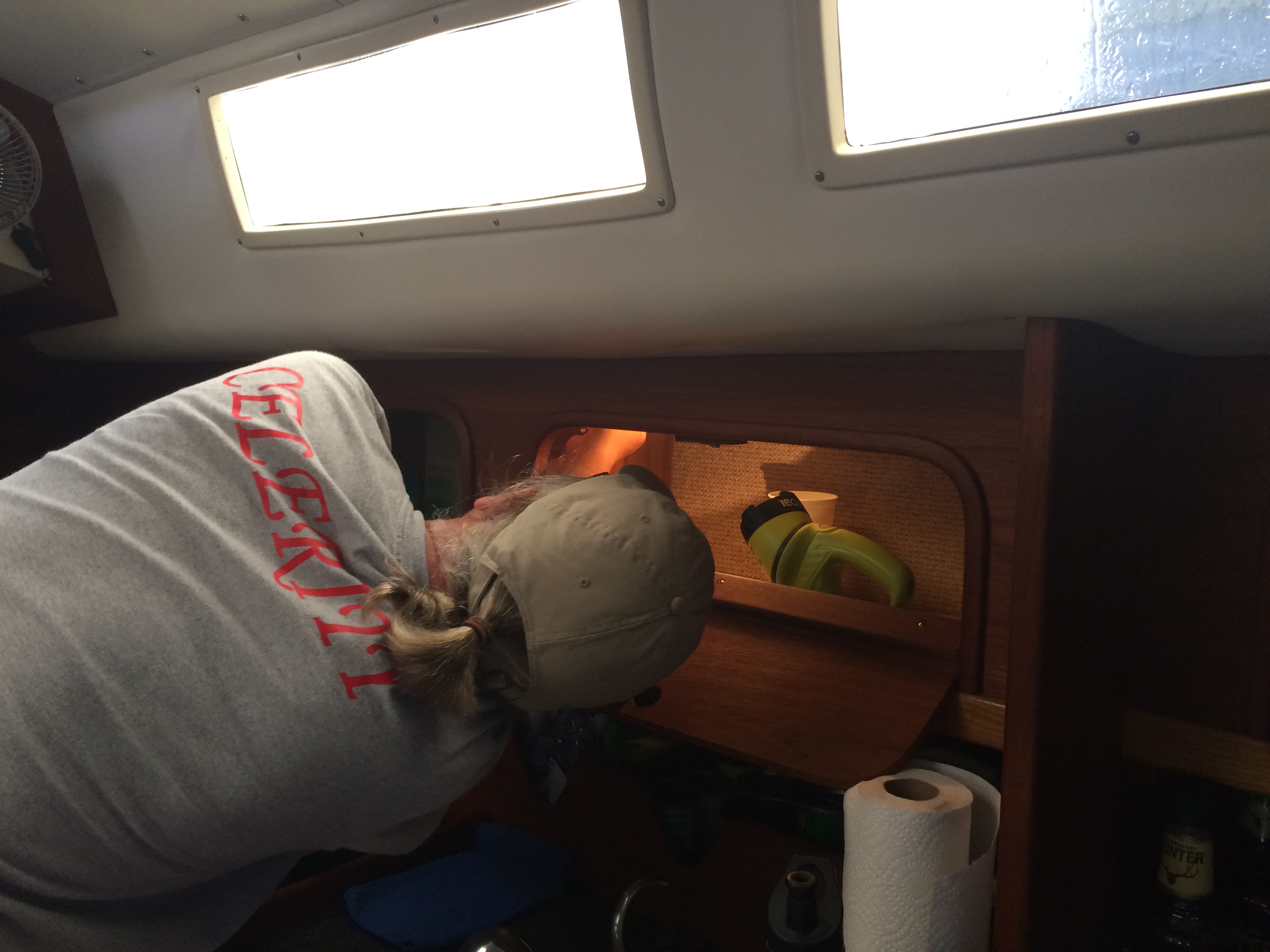 We’ve bragged about how dry FNR is. For a 30-year-old boat, she’s surprisingly watertight. But, on this particular morning when I reach for my cereal bowl, water sloshes all over the place. I glare at Steve. Great. Our first leak. Just what I need. More water.