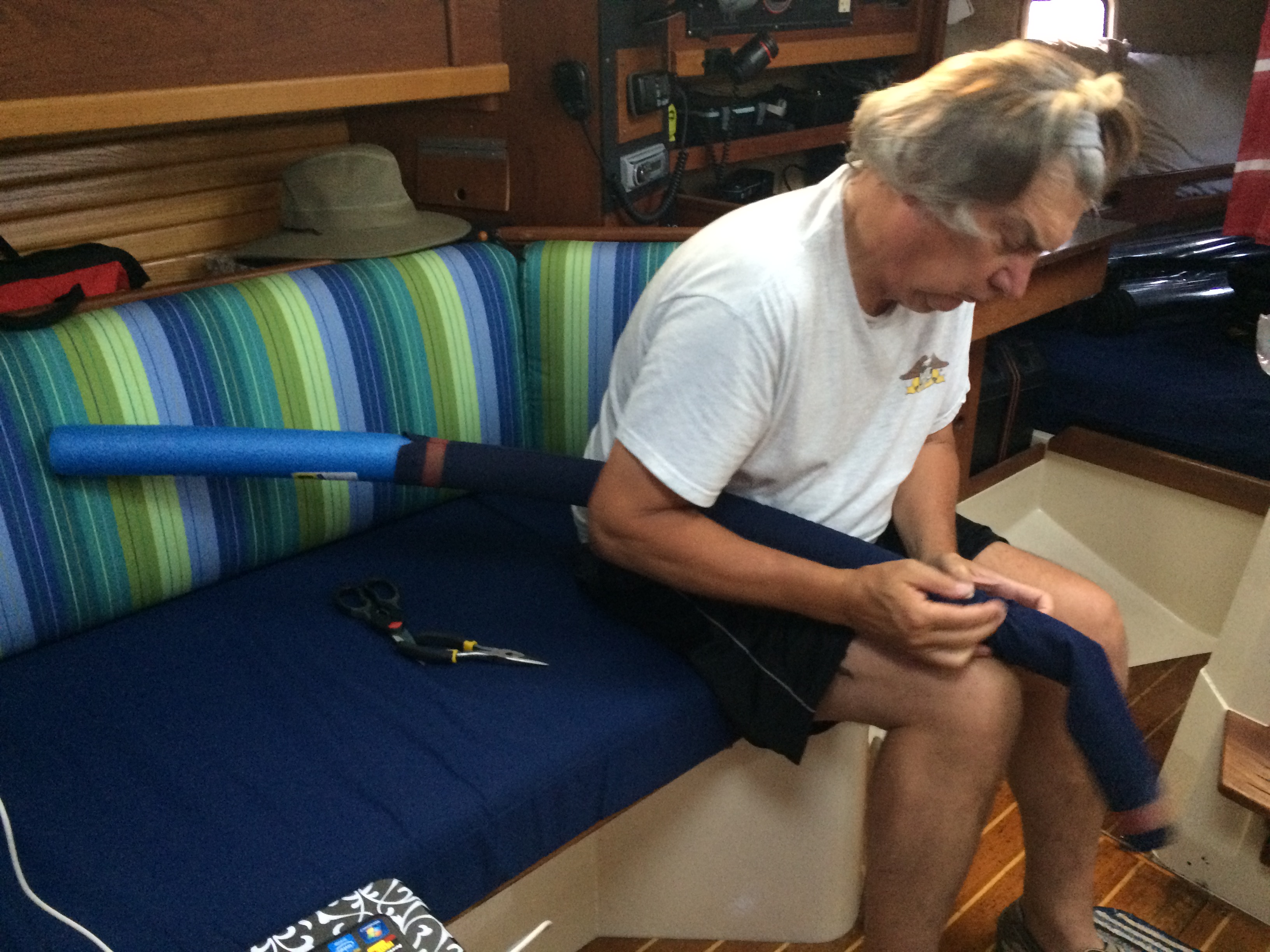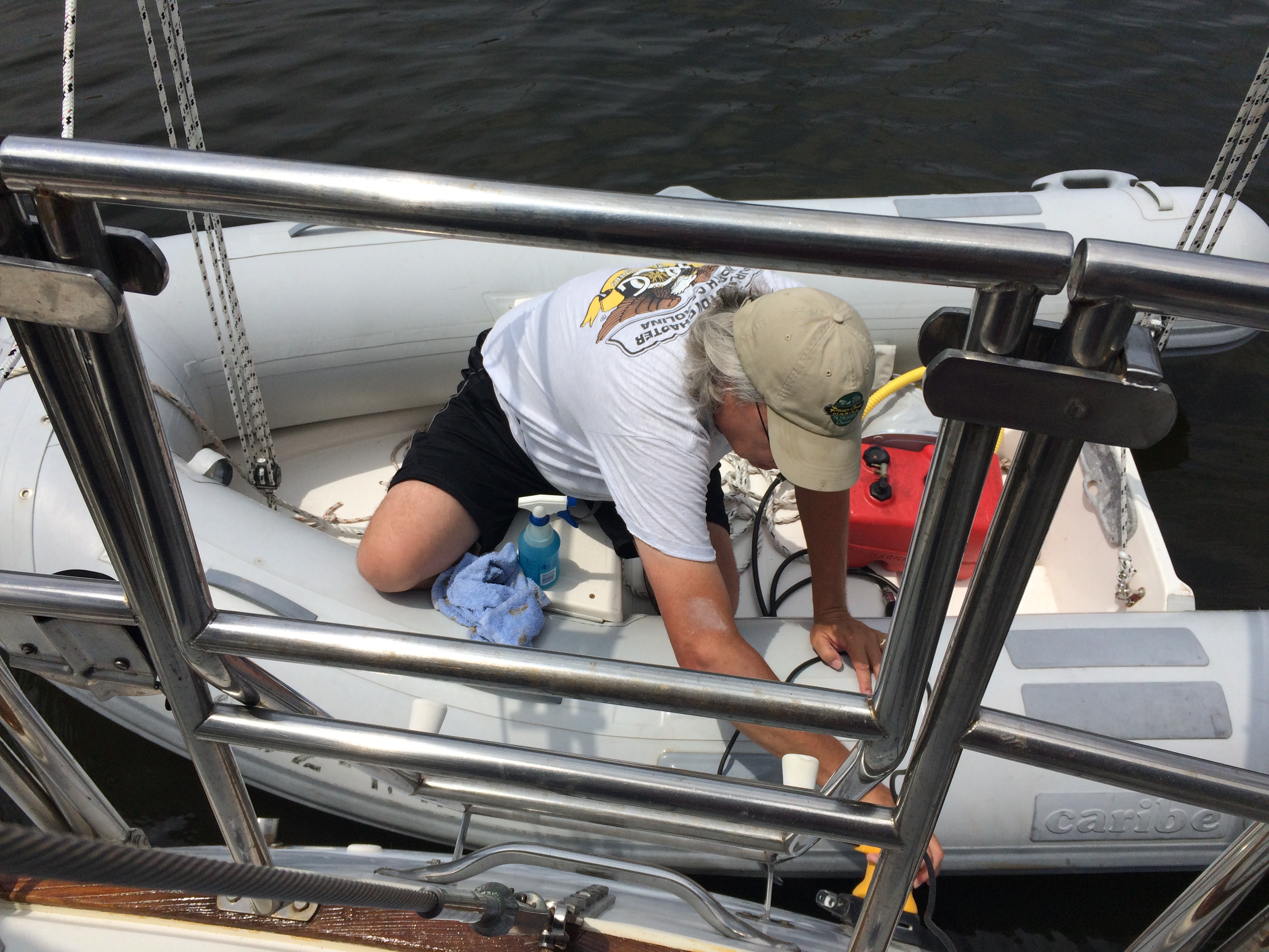 Dinghy? Almost check. We have a 2003 Caribe C-9 dinghy with an 8 horsepower Yamaha engine. There’s plenty of room for the two of us and since FNR has davits getting the dinghy in and out of the water is no big deal. We don’t have a motor lift but use a halyard to lift the motor on and off the dinghy. Right now, the only thing between us and a reliable dinghy engine is operator error.